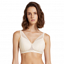 Поверх гладкой чашки, которая придает бюсту красивую округлую форму, проходит кружевное полотно с орнаментом в горошек, имитирующее бралетт. Завышенная линия декольте, высокая пройма и широкая спинка, которая у застежки становится выше, а также кружево, заходящее на бретели, скрывают возможные неровности и гарантируют безупречную посадку.